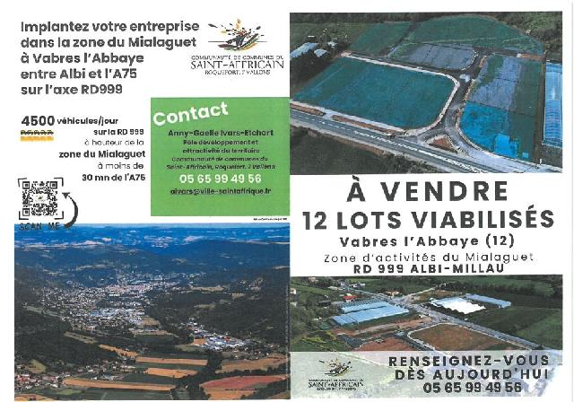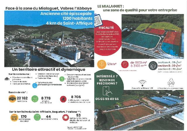 Description : IMPLANTEZ VOTRE ENTREPRISE sur la route départementale Albi-Millau (4 500 véhicules / jour) dans la zone d'activités du MIALAGUET. Un axe fort dans un territoire au tissu économique diversifié, bénéficiant d'une reconnaissance mondiale dans l'agroalimentaire avec le Roquefort. Autant d'atouts qui s'ajoutent au bien-vivre local, au territoire dynamique et engagé au cœur du Parc Naturel Régional des Grands Causses. Tout récemment commercialisée, la zone comporte 12 lots viabilisés, de 1 600 à 3 100 m2 (taille et nombre modulables) pour un prix entre 20 et 35 euros / m2. Elle se situe à Vabres l’Abbaye, ancienne cité épiscopale, à 4 km de Saint-Affrique. Le bassin de vie compte 22 162 habitants et 8 778 emplois. La communauté de communes compte (2024) : 170 commerces de détails, 44 services en vitrine, 53 restaurants, débits de boissons et traiteurs. La zone est classée en zone de revitalisation rurale (ZRR) induisant une EXONERATION TOTALE de l'impôt sur les sociétés durant 5 ans puis une exonération décroissante jusqu'à la 8e année